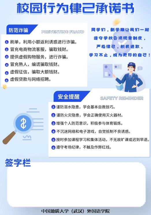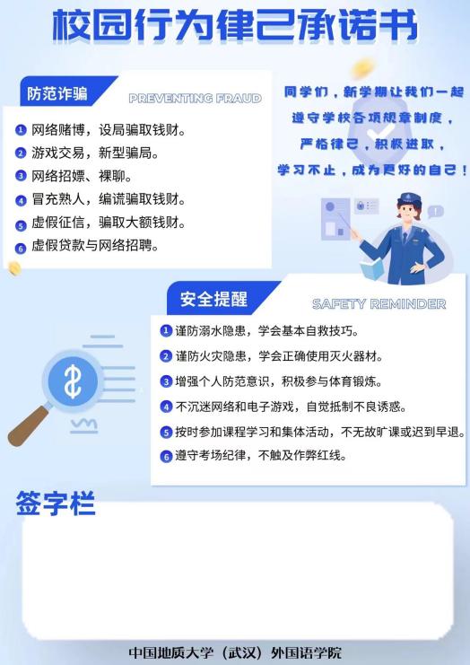 各班同学踊跃参与本次活动,校园律己行为承诺书发放到寝室后,同学们以寝室为单位进行承诺书的研读和学习探讨,明确了新学期学习生活律己要求,熟读每一条反诈提示与安全建议,进行了深入的反思与学习,并郑重的在承诺书签字栏处留下签名。