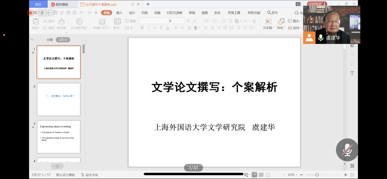(通讯员:黄皓亮 金梓轩)2021年11月25日下午14:00,best365官网“南望今声”外语论坛系列讲座如期召开。上海外国语大学文学研究院的虞建华教授应邀为公司师生做题为“文学论文撰写:个案解析”的讲座。本次讲座采取了线上腾讯会议直播的形式,公司共140余名师生参与学习交流。