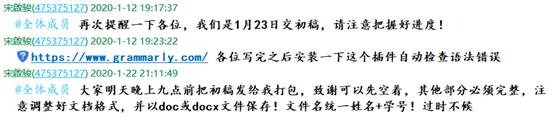 我们小组在11月开组会的时候定下了时间轴,1月20日我们赶在年前统一收齐了初稿,上交给导师张峻峰教授,在导师的远程指导下,统一于三月初提交二稿。疫情并没有打破计划和节奏,我们逆势而上,规律作息,适当运动,保证良好的精神状态,充分利用网络互帮互助,如:分享Grammarly写作插件,互相提供修改意见,帮助修改论文格式等。借此机会也希望各位同学能够在疫情面前更加团结,共同把好毕业年级的论文关!