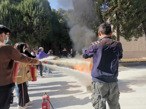 讲座之后,胡文勤老师带领与会同学在公司安全保卫部消防科老师们的指导下,在室外实地演练了干粉灭火器的灭火过程。