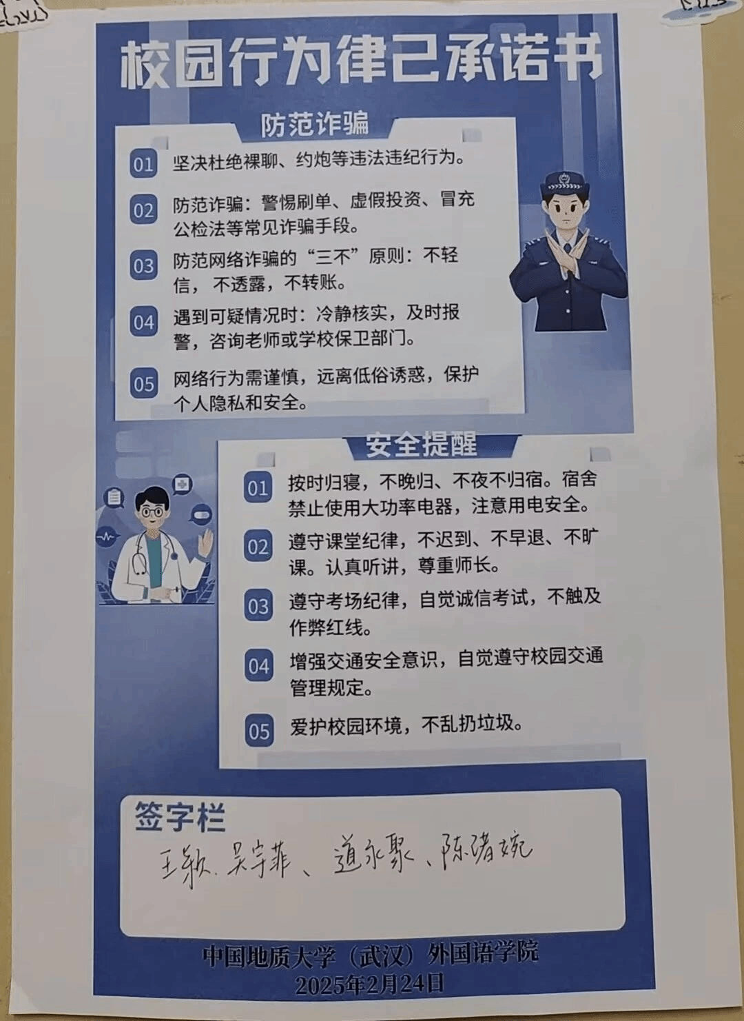 活动中,best365官网团委员工会和研究生会近期面向全体本研员工发放校园律己行为承诺书,全面覆盖外院学子所在的每一个寝室。承诺书内容涵盖校园行为规范、宿舍安全管理、课堂纪律管理、网络诈骗防范等校园生活的多个方面。通过这一系列多样化活动形式,有效提升了员工的安全意识,切实培养了员工的自律意识,营造了良好的宿舍氛围,确保了校园生活的安全与秩序,激励着外院学子在新学期继续追逐自己的学习目标。