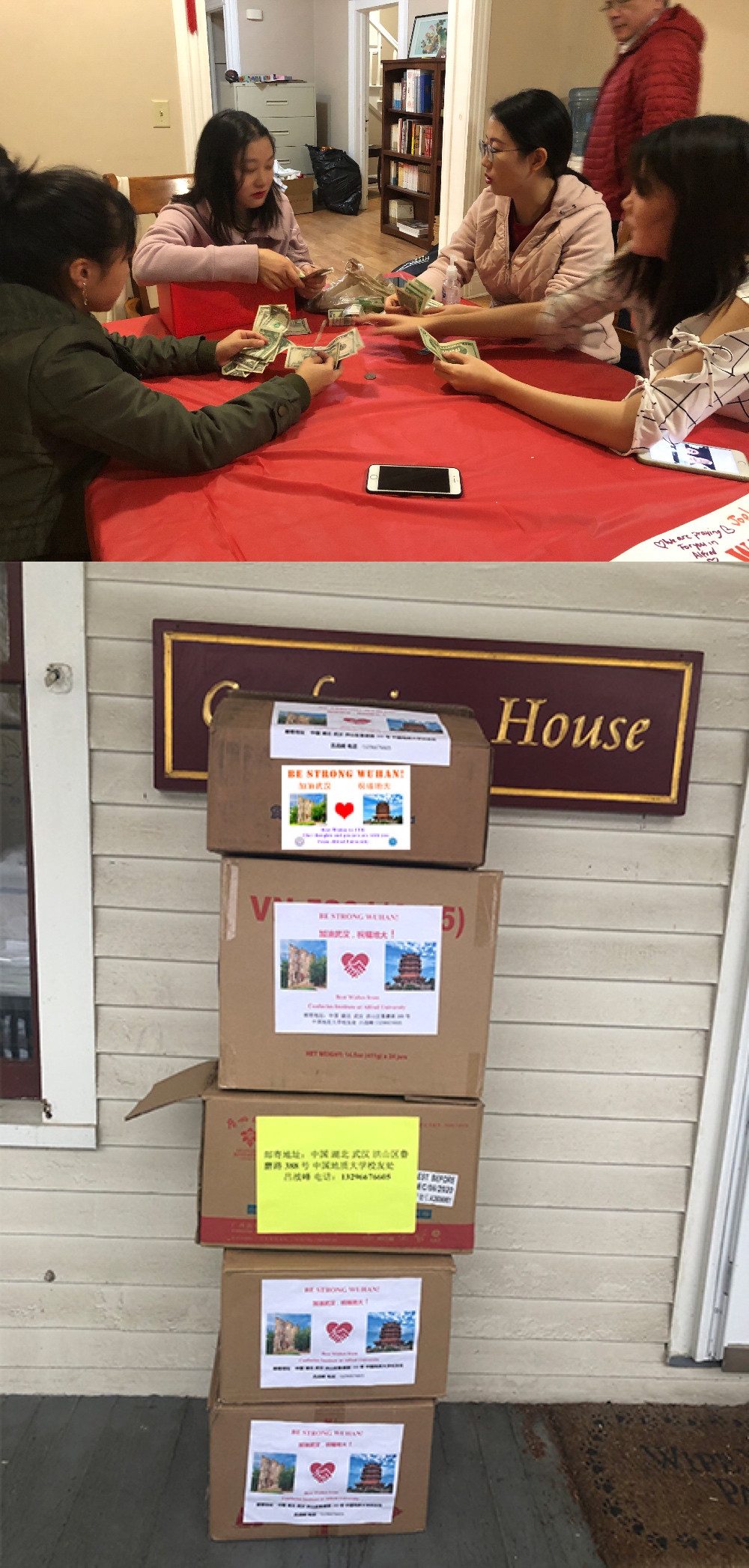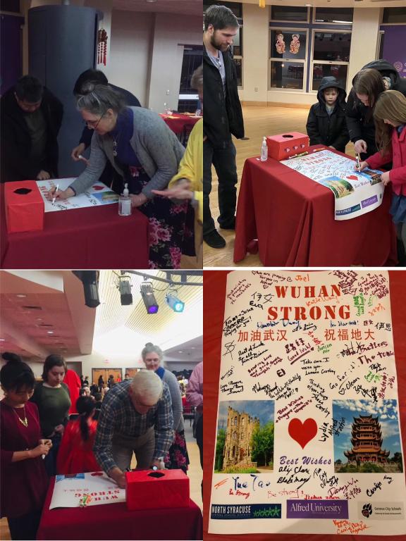 为了能够购买更多的医用物资,我们商量后决定再向阿尔弗莱德大学以及周边社区发起捐款的活动。于是我开始搜集各种资料,制作了一个“武汉加油”的视频以及一张签名海报,在一个晚会活动上,我们给来参加活动的教职工、员工和社区居民播放了视频,并向观众们介绍了武汉人们众志成城、抗击疫情的情况,讲述了地大(武汉)教职工积极努力,支持帮助近500名国际员工的生动事迹。