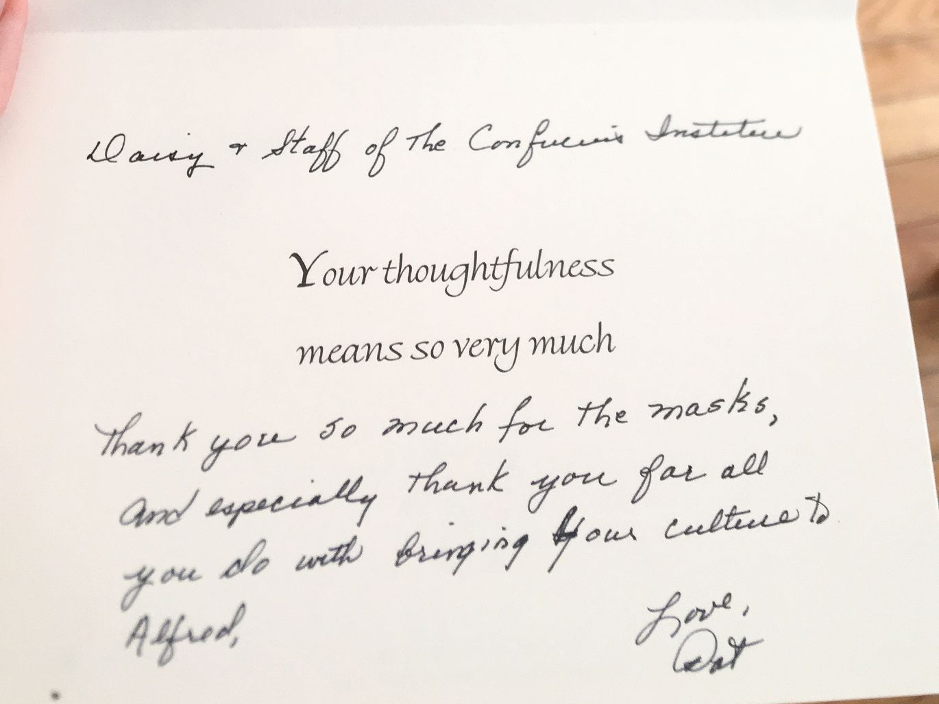 三月和四月,我们所居住的孔家变成了一个捐赠口罩的重要桥梁,我们通过邮件告诉公司还在工作的教职工和职工,还有周边社区的居民们,如果非常需要口罩(由于工作性质,像消防队、社区医院、公司食堂等部门还在工作;有些职工无法回国,也滞留在公司),可以邮件联系我们,我们会根据情况以及我们手头多余的口罩数量进行捐赠。我们把口罩用信封包起来在信封上写好名字,放在门口的信箱,通过邮件告诉他们取口罩的时间,这样就实现了零接触捐赠口罩。