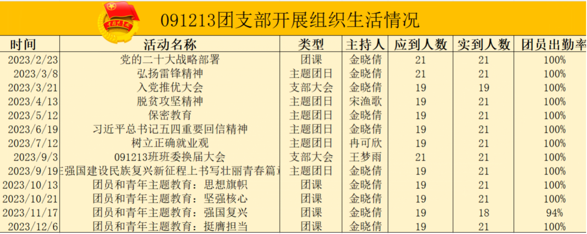 091213团支部由21名成员组成,其中金晓倩担任团支部书记,谢怡担任班长兼任团支部副书记,团支部现有团员 19 人,预备党员4名,发展对象2名。曾获校级先进班集体标兵(综合奖)、校级五四红旗团支部、校级活力团支部、校级先进班集体,成长与发展心理班会曾四次获得校级奖项,囊括校级一、二、三等奖。
