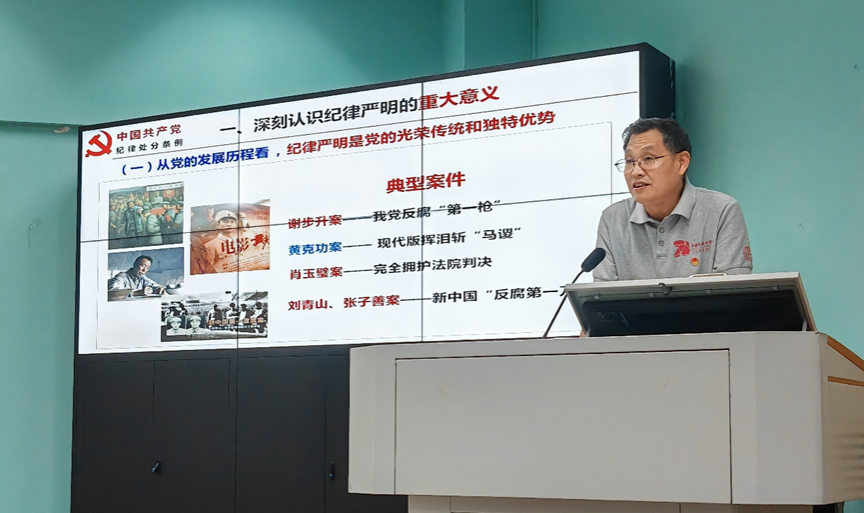 刘世勇从深刻认识纪律严明的重大意义、准确把握《中国共产党纪律处分条例》修订的主要内容和切实抓好《中国共产党纪律处分条例》的学习贯彻三个方面进行了宣讲。从党的发展历程、党面临的问题和党今后要实现的中心任务阐述了纪律严明的重大意义;结合《条例》内容,指出这次修订突出了政治性,体现了时代性,提高了针对性,增强了衔接性;他要求大家增强纪律观念,提高学习的自觉性和主动性,增强监督意识,提高贯彻执行力,落实到日常学习工作生活中。他还对员工党员在网络和社交媒体上的言行操守做出了重点提醒。最后,他希望大家心有所畏,言有所戒,行有所止。
