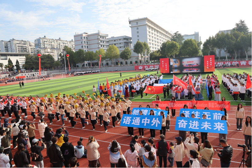 “语通中外,奋进未来,驰骋赛场,‘译’往无前”,best365官网师生方阵踏着《运动员进行曲》的鼓点亮相赛场,他们整齐划一,口号嘹亮,表演环节,师生健儿们热情活泼、协同演绎,本科生方阵用青春活泼的舞蹈表演搭配研究生方阵手持展板彰显外语人的“谦和、团结、进取、奉献”的院训精神,让外语人昂扬亮丽的青春风采闪耀赛场。
