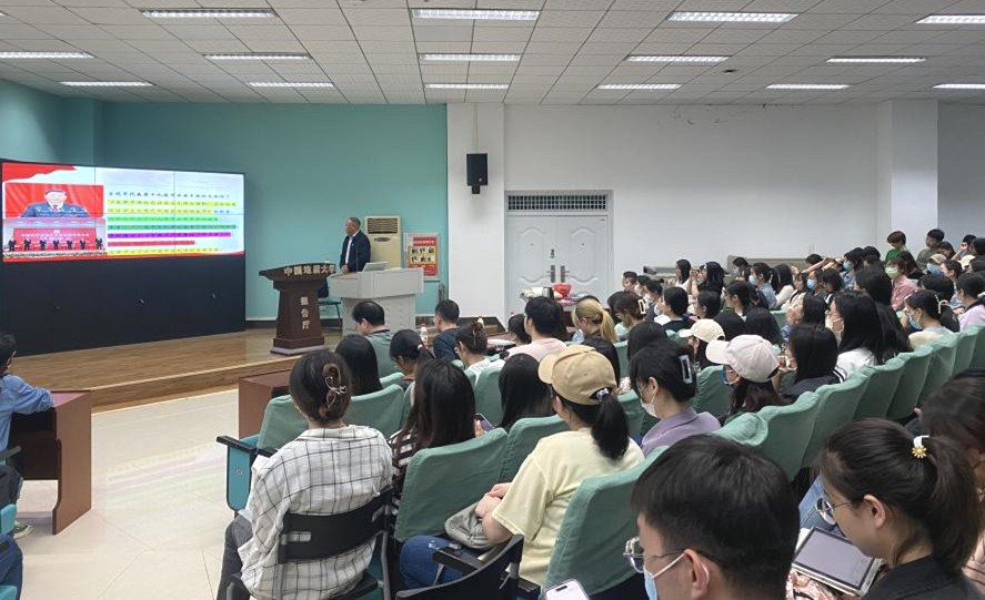 丁振国教授以《奋进新征程,创造新伟业——学习贯彻党的二十大精神》为题讲授党课。他带领大家回顾了党的二十大概况,重点讲述了党的二十大的重要意义、主要精神,同时引导大家用实际行动积极践行二十大精神,最后结合习近平总书记对新时代青年的寄语和联合国科教文组织界定的老员工的主要任务,针对best365官网员工专业特点提出学习和成长建议,激励大家勇敢面对困难和挑战,为实现中华民族伟大复兴而踔厉奋发,笃行不怠。讲解过程中,他结合“四史”、国情和自身经历,旁征博引,深入浅出,还与同学们进行问题抢答互动,为正确回答问题的同学送上了自己精心准备的奖品。