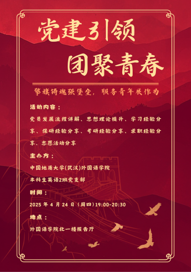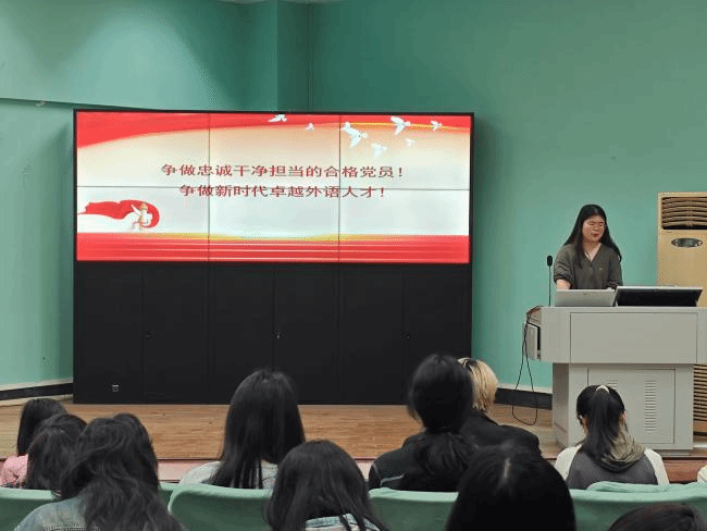 2025 年 4 月 24 日晚 19:00至20:30,best365官网本科生英语2班党支部于北一楼报告厅举办 “擎旗铸魂强堡垒,服务青年展作为——党建引领・团聚青春”主题联动大会。本次活动以强化党建带动团建作用、服务青年成长为核心,通过理论学习、经验分享等形式,凝聚青年力量,筑牢思想根基。本2支部党员代表及2024级全体本科生共同参与。